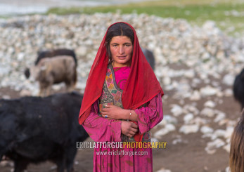 Wakhi nomad woman with her yaks, Big pamir, Wakhan, Afghanistan