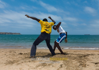 Angolan boys dancing capoeira on the beach, Namibe Province, Namibe, Angola