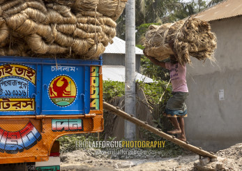 Bangladeshi man loading burlap on a truck, Dhaka Division, Nagarpur, Bangladesh