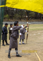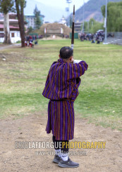 Bhutanese man aims arrow in archery competition, Chang Gewog, Thimphu, Bhutan
