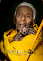 Old ethiopian nun in yellow shawl, Amhara Region, Lalibela, Ethiopia