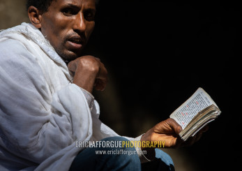 Orthodox man praying with a bible, Amhara Region, Lalibela, Ethiopia