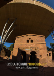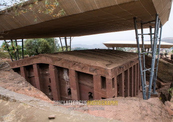 Protective shelters over a monolithic rock-cut church, Amhara Region, Lalibela, Ethiopia