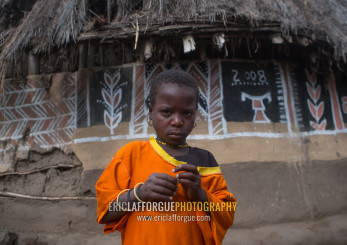 Ethiopia, Kembata, Alaba Kuito, ethiopian boy standing in front of his traditional painted house