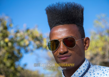 Ethiopian young man with incredible gelled hair, Amhara region, Lalibela, Ethiopia