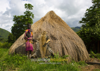 Suri woman posing near an animal skin, Tulgit, Omo valley, Ethiopia