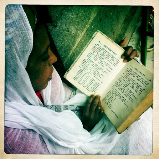 Portrait of an ethiopian monk woman in yellow shawl with a flyswatter, Amhara region, Lalibela, Ethiopia