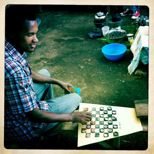 Lonely ethiopian orthodox man praying with a bible, Amhara region, Lalibela, Ethiopia