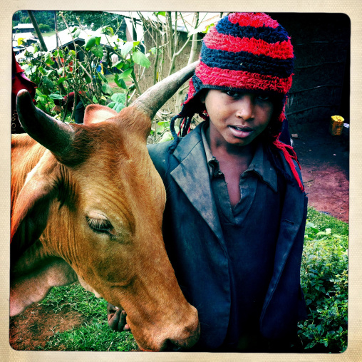 Ethiopia, Kembata, Alaba Kuito, ethiopian boy standing in front of his traditional painted house