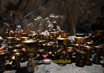 Pilgrim cleaning oil lamps in Shey Monastery, Ladakh, Shey, India