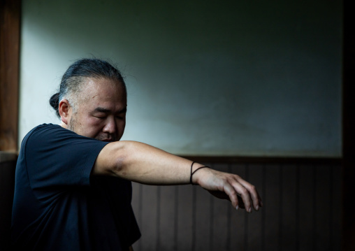 Hairdresser making a bun to a sumo wrestler, Kanto region, Tokyo, Japan
