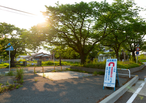 Diversion sign warns people in the difficult-to-return zone after the daiichi nuclear power plant irradiation, Fukushima prefecture, Tomioka, Japan