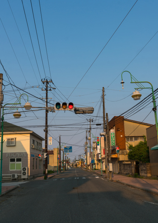 Deserted street in the difficult-to-return zone after the daiichi nuclear power plant irradiation, Fukushima prefecture, Tomioka, Japan