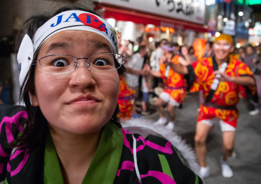 Japanese dancers during the Koenji Awaodori dance summer street festival, Kanto region, Tokyo, Japan
