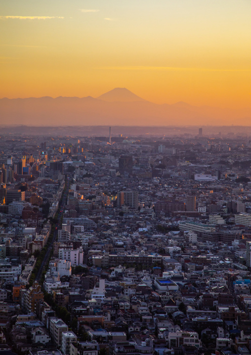 Tokyo downtown and mount fuji view at sunset, Kanto region, Tokyo, Japan