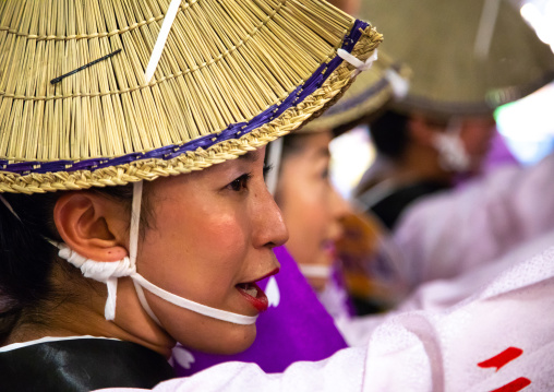 Japanese women with straw hats during the Koenji Awaodori dance summer street festival, Kanto region, Tokyo, Japan