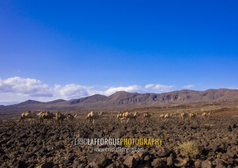 Camel herd on volcanic rocks, Turkana lake, Loiyangalani, Kenya