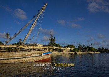 Fishing dhows moored along coastline, Lamu county, Matondoni, Kenya