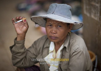 Woman smoking a cigarette, Pakse, Laos