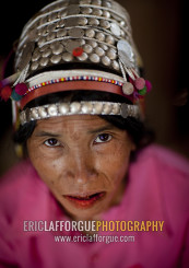 Akha minority woman with traditional headdress, Ban ta mi, Laos
