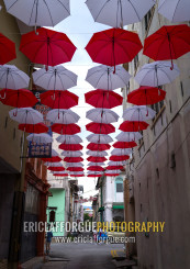 Red And White Umbrellas Above Street, Perak State, Ipoh, Malaysia