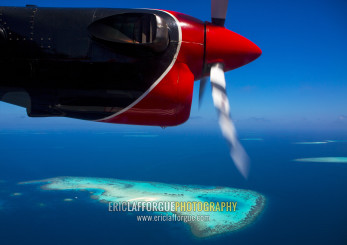 Maldivian Air Taxi Seaplane Flying Over An Atoll, Male, Maldives