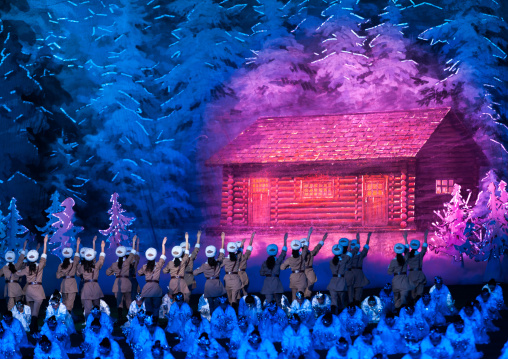 North Korean dancers performing in front of Kim Jong il native house during Arirang mass games in may day stadium, Pyongan Province, Pyongyang, North Korea