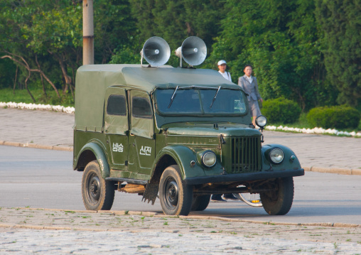 Old military jeep with loudspeakers propaganda on the top, North Hwanghae Province, Kaesong, North Korea