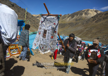 Devotee With Embroidered Banner During Qoyllur Riti Festival, Ocongate Cuzco, Peru
