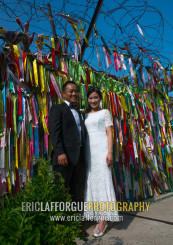 North korean defector joseph park with his south korean fiancee juyeon in front of messages of peace written on ribbons left on dmz, Sudogwon, Paju, South korea