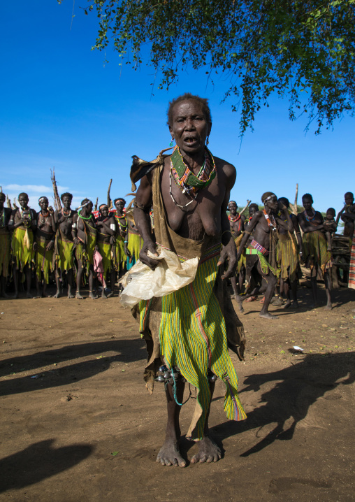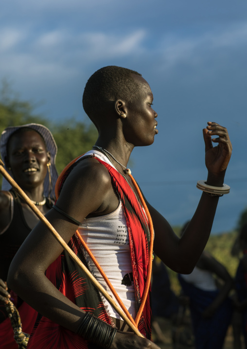 Toposa tribe woman in traditional clothing dancing during a ceremony, Namorunyang State, Kapoeta, South Sudan