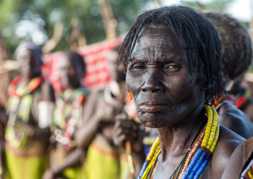 Portrait of a Larim tribe woman wearing bark bracelets as a sign of mourning, Boya Mountains, Imatong, South Sudan