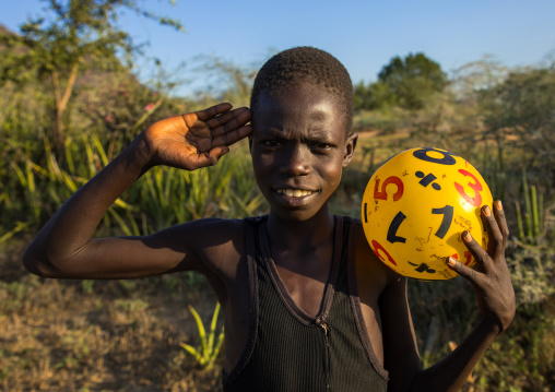 Portrait of a Larim tribe boy saluting with the hand, Boya Mountains, Imatong, South Sudan
