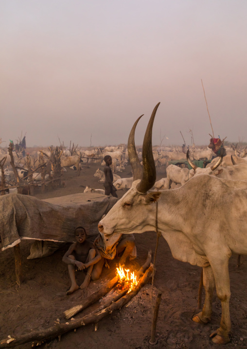 Mundari tribe boys taking care of the bonfires made with dried cow dungs to repel flies and mosquitoes, Central Equatoria, Terekeka, South Sudan
