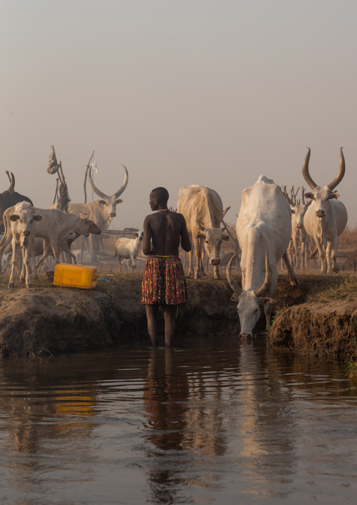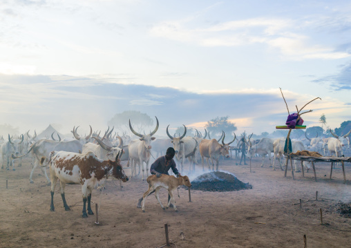 Mundari tribe man taking care of the long horns cows in a camp, Central Equatoria, Terekeka, South Sudan
