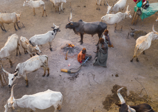 Aerial view of long horns cows in a Mundari tribe cattle camp, Central Equatoria, Terekeka, South Sudan