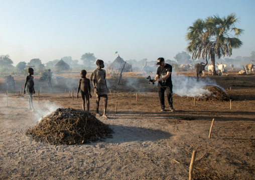 Tourist filming Mundari tribe boy taking care of the bonfires made with dried cow dungs, Central Equatoria, Terekeka, South Sudan