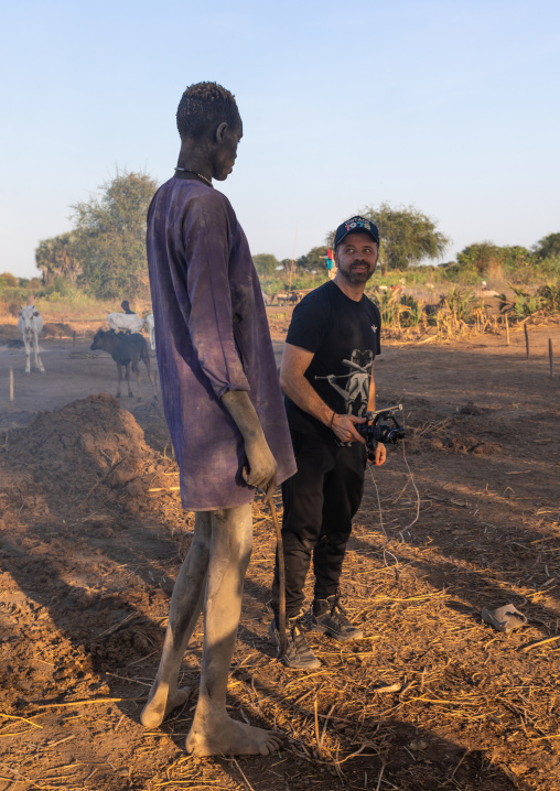 Western tourist with a tall Mundari man, Central Equatoria, Terekeka, South Sudan