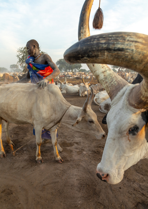 Mundari tribe man with long horns cows in a camp, Central Equatoria, Terekeka, South Sudan