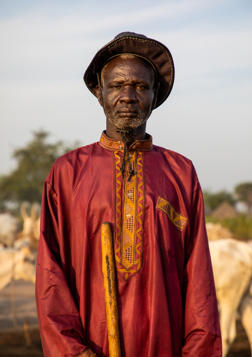 Portrait of a Mundari tribe man in traditional clothing with his cows, Central Equatoria, Terekeka, South Sudan