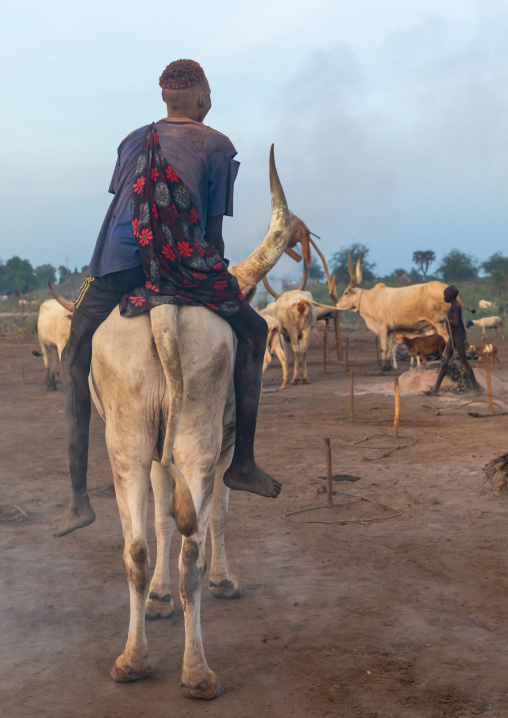 Mundari tribe man riding a long horns cow, Central Equatoria, Terekeka, South Sudan