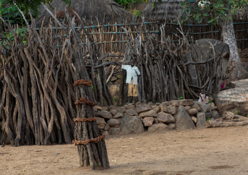 Larim tribe boy in front of a house designed for the children, Boya Mountains, Imatong, South Sudan