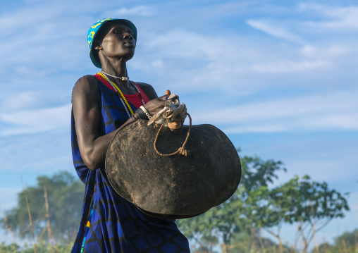 Mundari tribe woman carrying a yellow jerrican on the head, Central Equatoria, Terekeka, South Sudan
