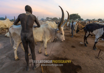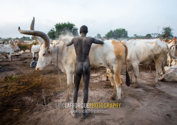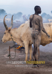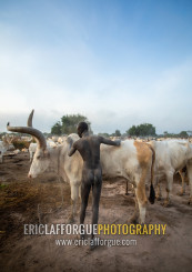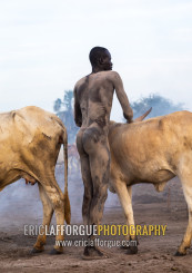 Naked Mundari tribe man covering his cow in ash to repel mosquitoes, Central Equatoria, Terekeka, South Sudan