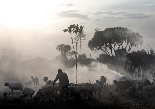 Mundari tribe man taking care of the bonfires made with dried cow dungs to repel mosquitoes and flies, Central Equatoria, Terekeka, South Sudan