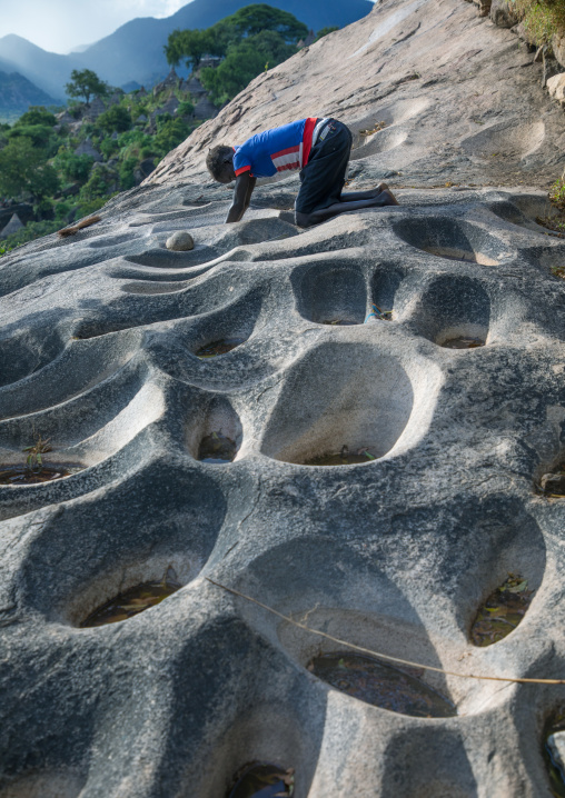 Lotuko tribe woman grinding grains in a hole in the rock, Central Equatoria, Illeu, South Sudan