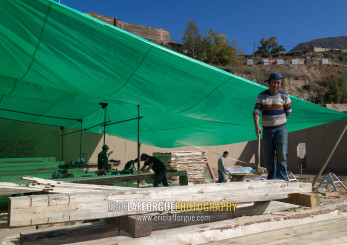Carpenters building a new wooden house, Tongren County, Rebkong, China