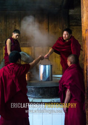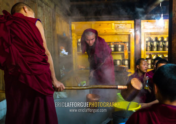Monks in the kitchen of Rongwo monastery, Tongren County, Longwu, China