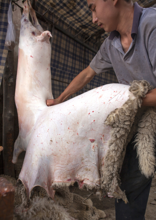 Young Uyghur Man Removing The Skin Of A Sheep, Keriya, Old Town, Xinjiang Uyghur Autonomous Region, China
