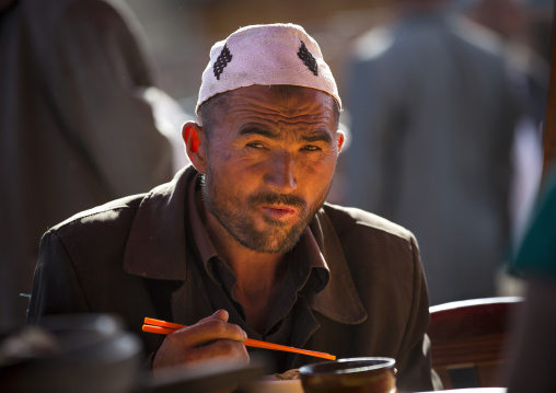 Uyghur Man Eating In Serik Buya Market, Yarkand, Xinjiang Uyghur Autonomous Region, China